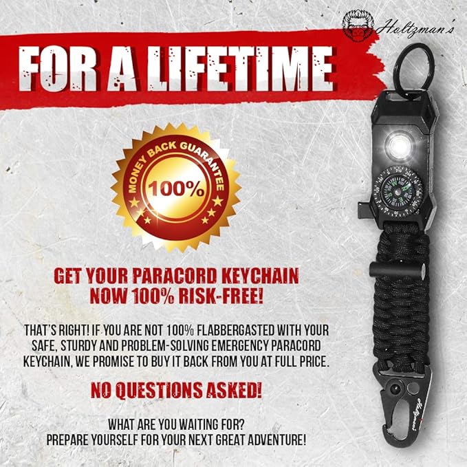 - ✅ GET YOUR PARACORD KEYCHAIN NOW 100% RISK-FREE! That’s right! If you are not 100% flabbergasted with your safe, sturdy and problem-solving emergency paracord keychain, we promise to buy it back from you at full price. No questions asked! What are you waiting for? Prepare yourself for your next great adventure!