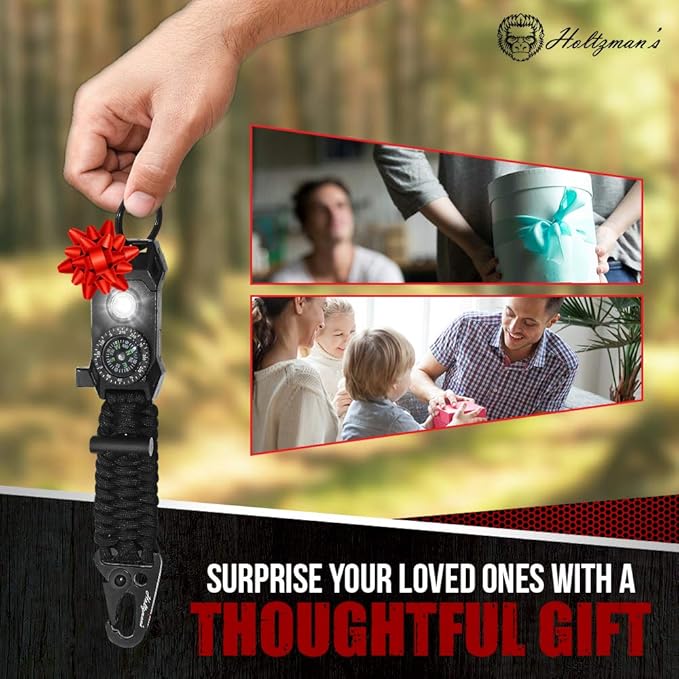 - 🎁 SURPRISE YOUR LOVED ONES WITH A THOUGHTFUL GIFT! Do you want to keep your friends and family safe at all times? Spoil your husband, boyfriend, son, brother, father or grandfather with the Holtzman’s Gorilla Survival 5-in-1 paracord keychain and make sure that they always have an emergency survival multitool with them!