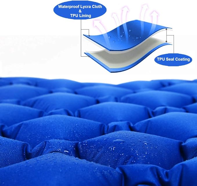 - MORE DURABLE & STURDY:This Inflatable camping mat is made of the ripstop Lycra cloth, with durable self-inflating sleeping mats, waterproof TPU lining, max load 200 kg, moisture proof, scratch resistant, tear-proof and wear-resistant without toxic bad smell