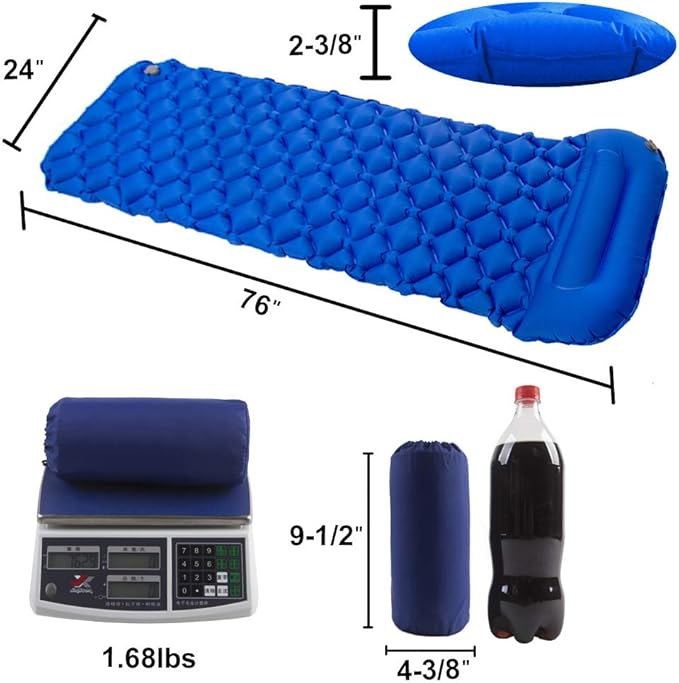 - INFLATABLE SLEEPING PAD FOR OUTDOORS: The portable air mattress pad is inflatable to 76" x 24" x 2-3/8" in size and deflates to 4-3/8" round x 9-1/2"