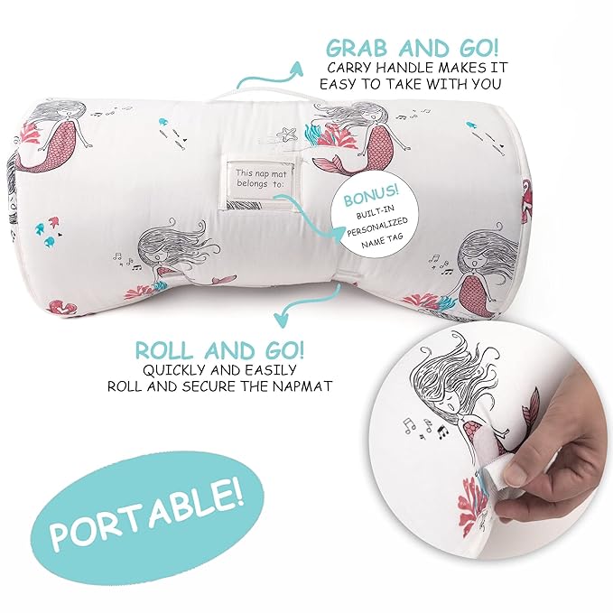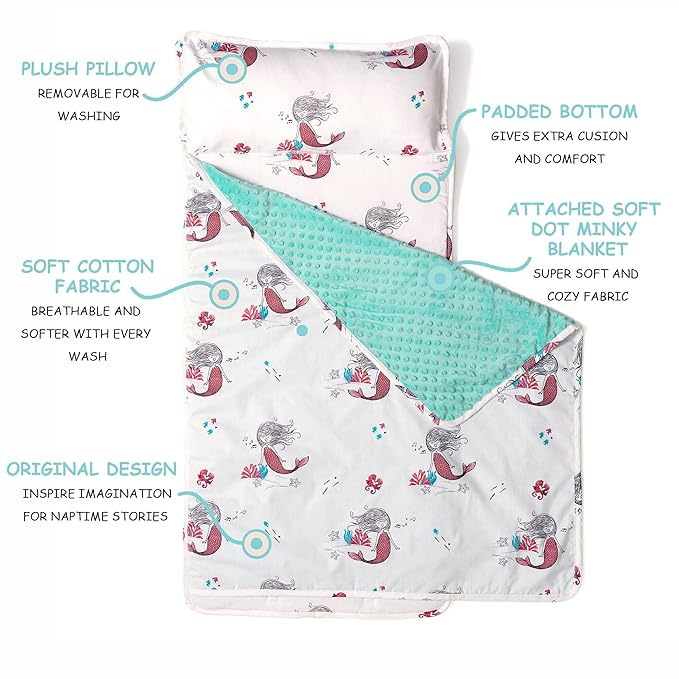 JumpOff Jo - Toddler Nap Mat - Sleeping Bag for Kids with Removable Pillow and Ultra Soft Blanket for Preschool, Daycare, and Sleepovers - Mermaids