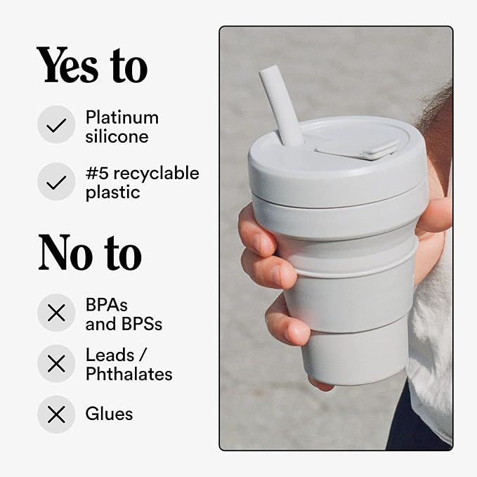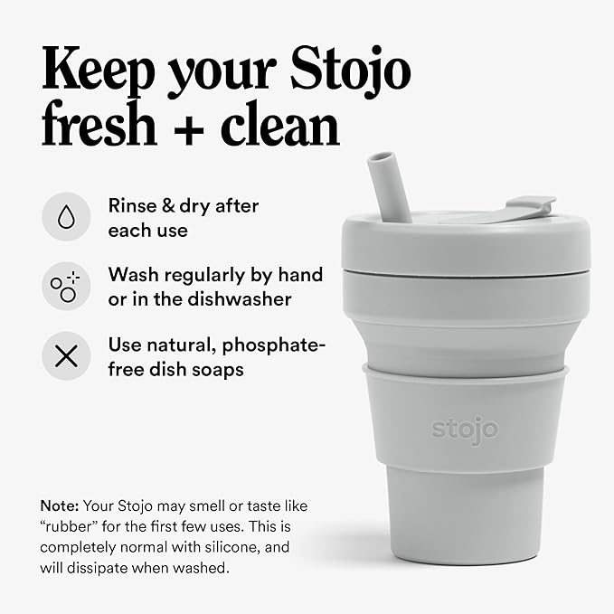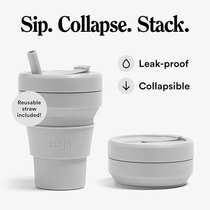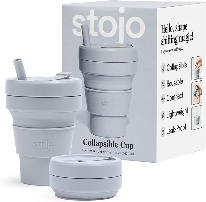 - Collapsible cup: It’s literally never been easier (or more fun) to bring your own reusable cup! This compact cup collapses down to just 2 inches. Whether you’re sipping coffee or a smoothie, the 16 oz Stojo is perfectly portable for your commute, camping trips, tea at home, and travels. When you’re done, simply remove the heat sleeve, open the tab, and collapse it down. Leak-proof, includes a straw, fits standard cupholders, and get a load of that Cashmere Gray color!