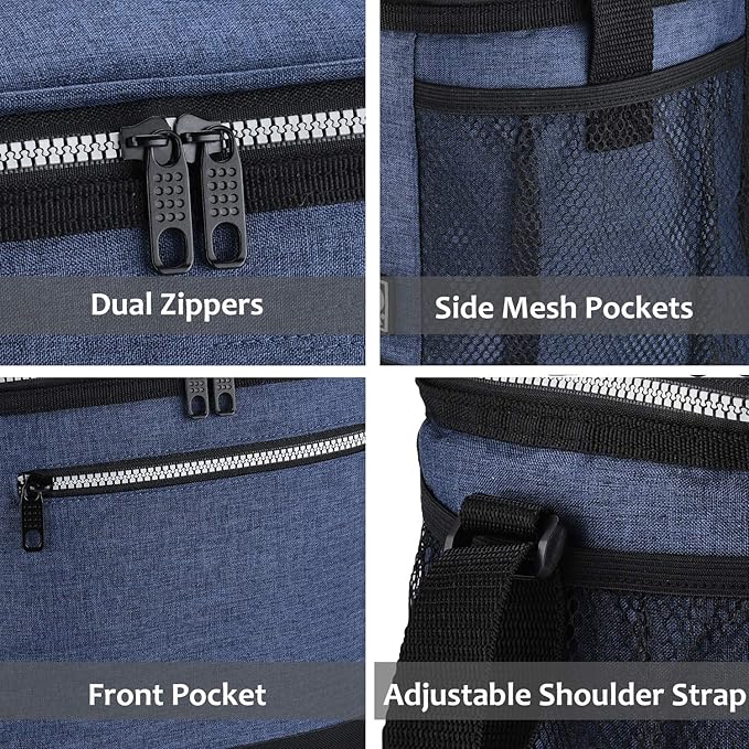 - PORTABLE DESIGN - The adjustable shoulder strap also facilitates you to take this lunch bag out for office or gym. Double zippers design for easy access. You can store small things in the two side mesh and front pocket.