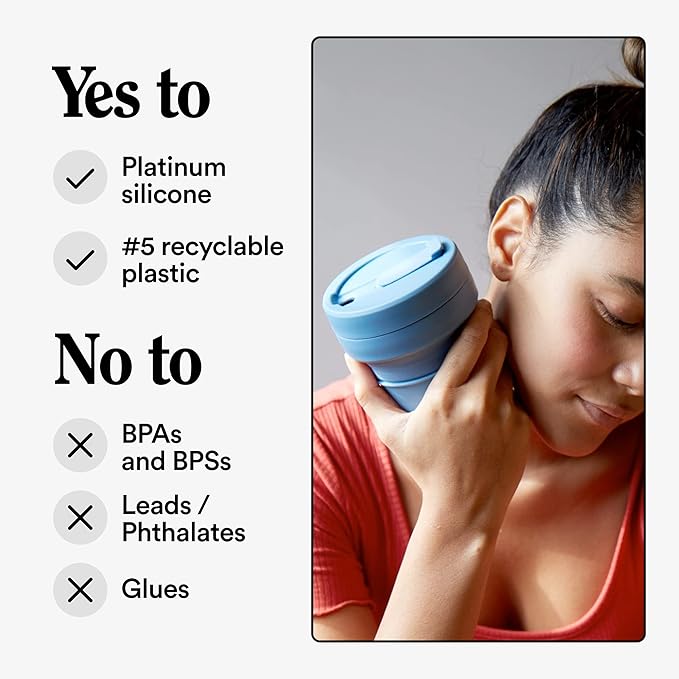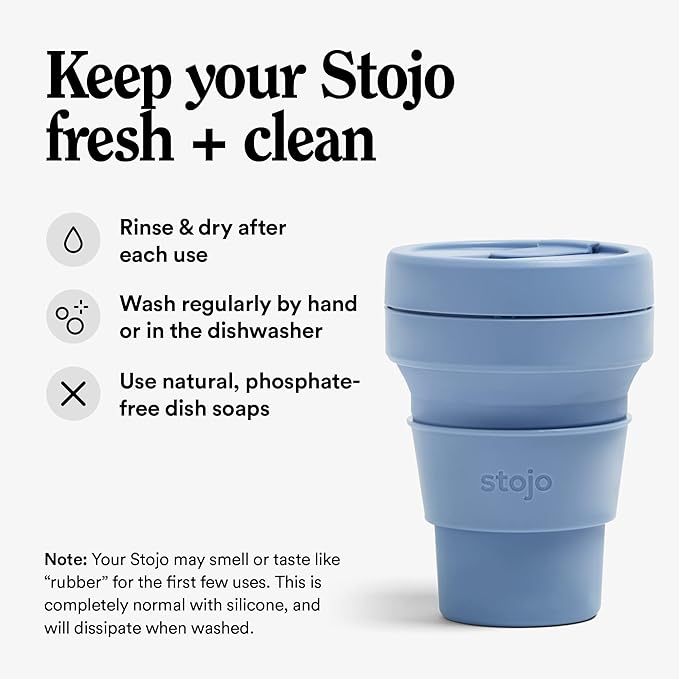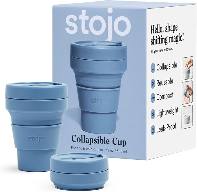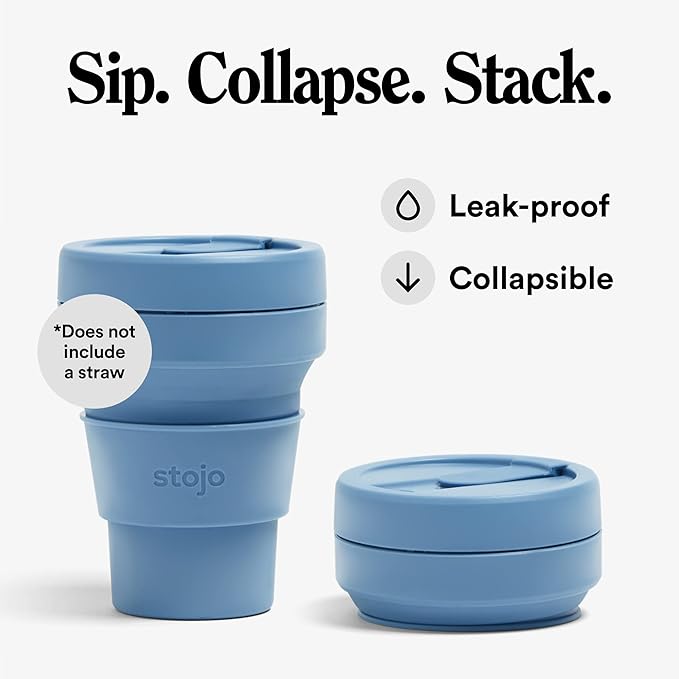 - Collapsible cup: It’s literally never been easier (or more fun) to bring your own reusable cup! This compact cup collapses down to just 2 inches. Whether you’re enjoying coffee or smoothies, the 12 oz Stojo is perfectly portable for your commute, camping trips, and travels. When you’re done, simply remove the heat sleeve, open the tab, and collapse it down. Leak-proof, fits standard cupholders, and get a load of that Steel Blue color!