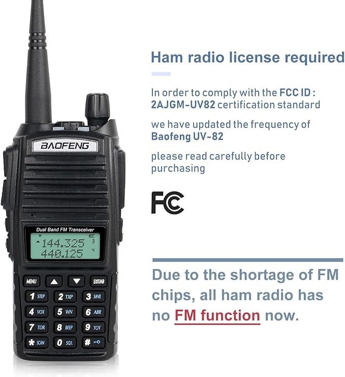 - ✔️128 Channels Memory,Power Save, VOX, Scan, Alarm,Dual Watch Functions,Time out timer,Busy Channel Lock-out Function (BCLO),fully in compliance with the FCC part 15B and part 97 regulations. FCC ID: 2AJGM-UV82