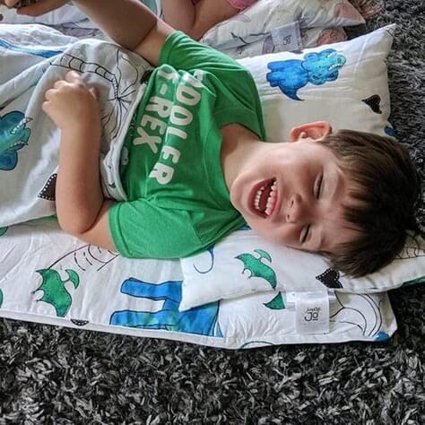 JumpOff Jo - Toddler Nap Mat - Sleeping Bag for Kids with Removable Pillow and Ultra Soft Blanket for Preschool, Daycare, and Sleepovers - Blue Dino