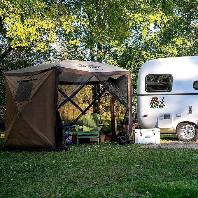 CLAM Venture 9 x 9 Foot Portable Outdoor Gazebo Canopy Camping Tent Shelter, with 3 Wind and Sun Panels and Carry Bag Accessory, Brown
