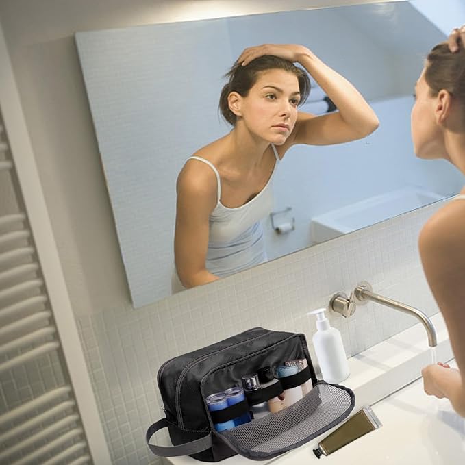 - 【ORGANIZED COMPARTMENTS】 --- Main compartment that holds larger items such as shampoo bottles or shaving cream. One zippered mesh pouch that keeps your smaller toiletries and cosmetics in a place visible and breathable. Other side front zipper pocket that provides extra storage with easy.