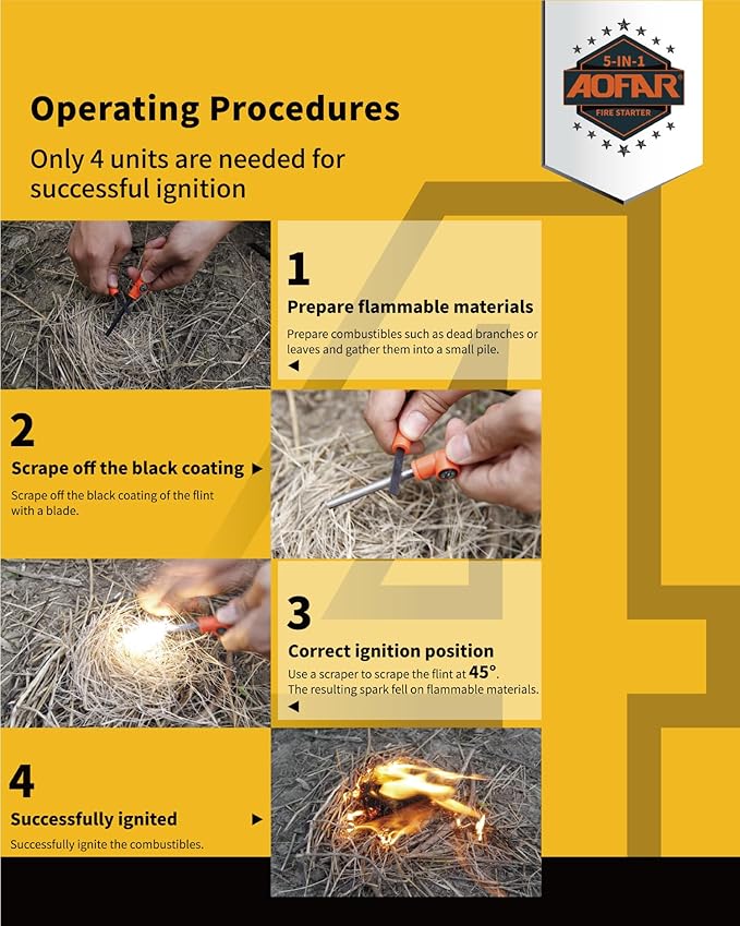 - MULTI-PURPOSE FLINT FIRE STEEL:3"Unique design scraper, 5"Rod,Match Survival Ropes,Compass,Emergency Whistle.