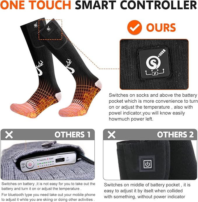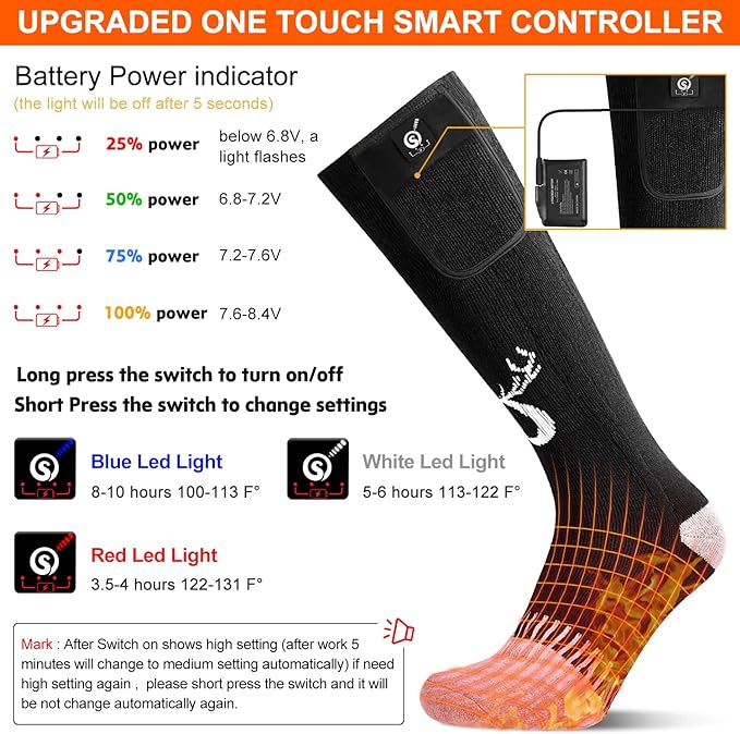 - 【Use 7.4V Instead of 3.7V & 5V Battery & with Touch-Button Temperature Control】: SNOW DEER battery heated socks used 7.4V 2200mAh lithium polymer rechargeable battery .the heating time will longer than 3.7V&5V heated socks and the temperature will be more stable. Also it is with 3 heat setting smart controller for you adjust the temperature easily.