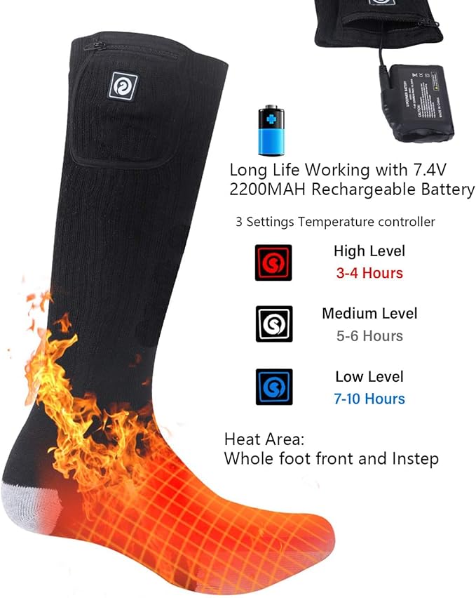 - 【Quality Imported Material】This winter socks have long life work time with 7.4V 2200MAH Li-ion rechargeable battery.Imported heating elements and quality material.It can keep you warm all day (especially for chronically cold feet), Dual cable charging system for the batteries to charge at the same time, the ease of removing batteries. Long-lasting heating, long life batteries, no longer afraid of the cold.
