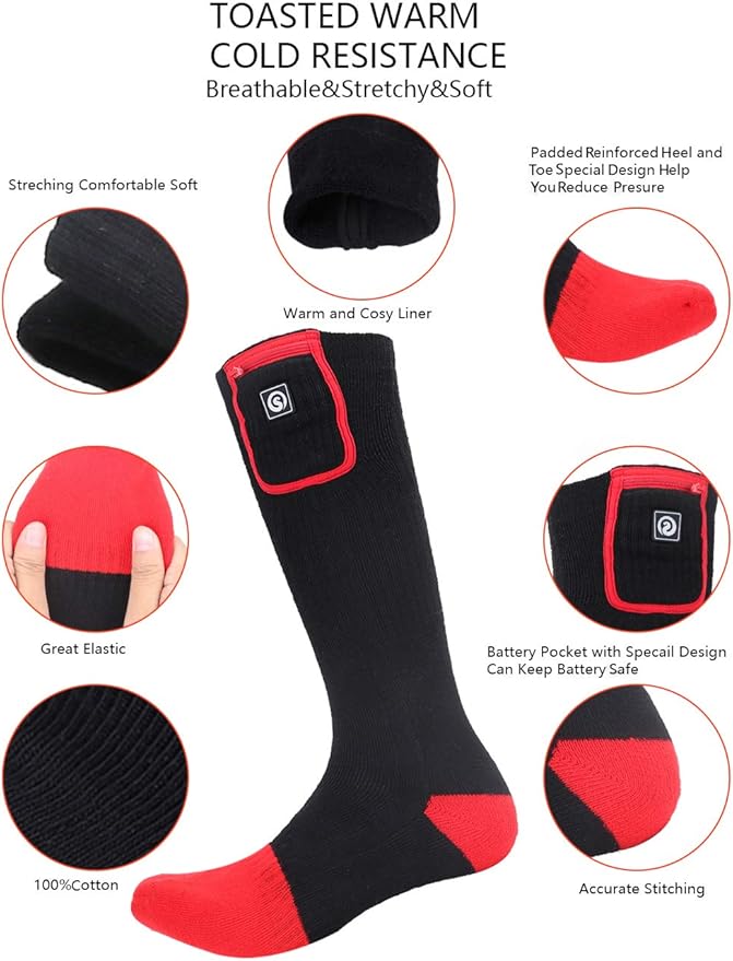 - 【Soft and Breathable】Heating socks with super comfortable, thick and well padded.Absorbent, breathable, quick-drying, elastic-thicken, use ultra-thin electric heating module.Soft Padded reinforced heel & toe accurate stitching and recessed heating element help focus heat on the toe to keep your feet warm from cold weather.