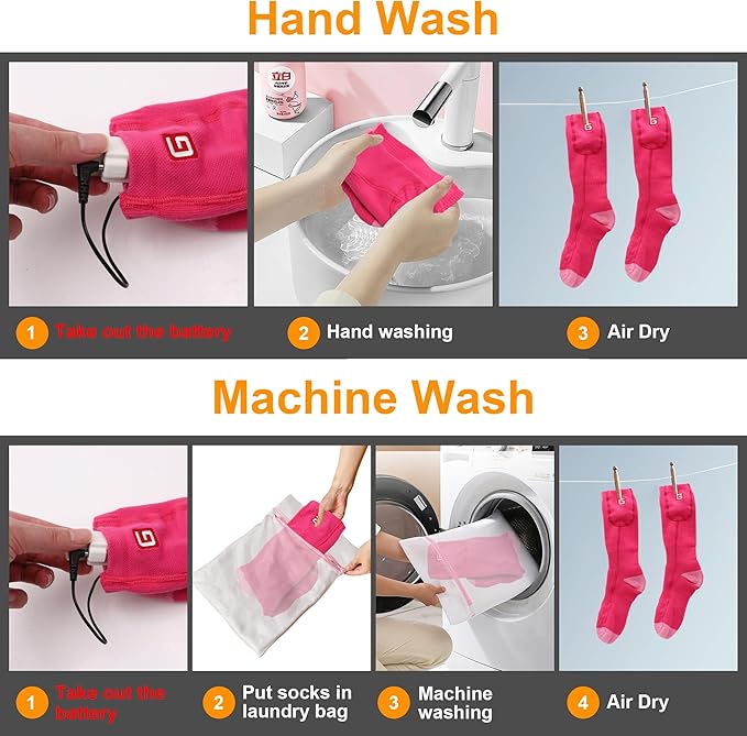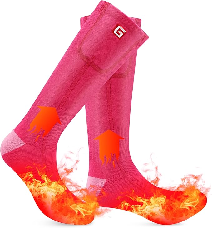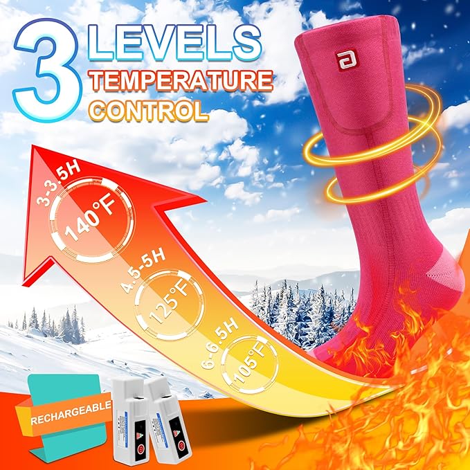 - ❄️【Powered by Rechargeable Batteries & 3 Heating Temperature Settings】The electric socks equipped with a pair of rechargeable batteries. Heating up to 6.5 hours. Battery powered socks with 3 heat setting High(Red, 100% heat) lasts 3-3.5h / Medium(Orange, 75% heat) lasts 4.5-5h / Low(Green, 50% heat) lasts 6-6.5h