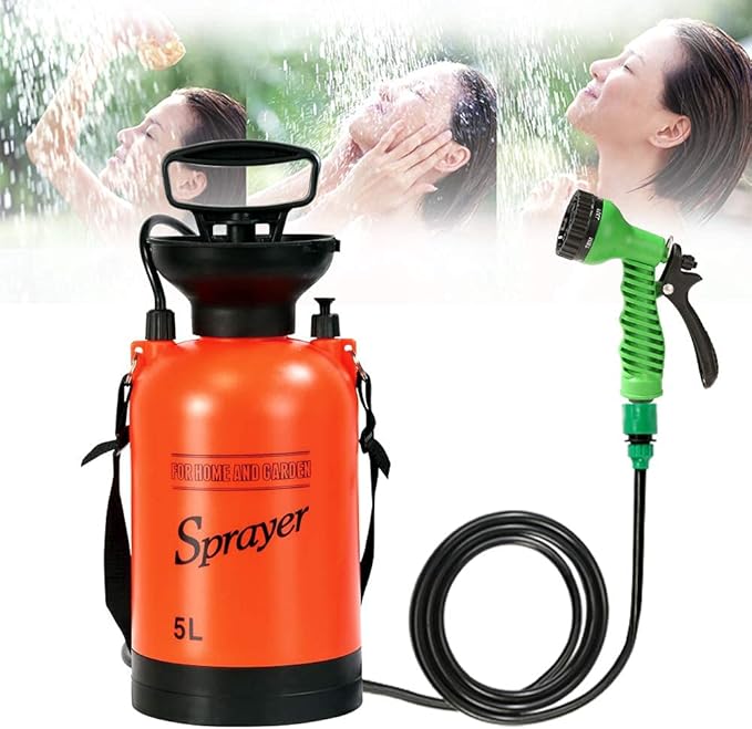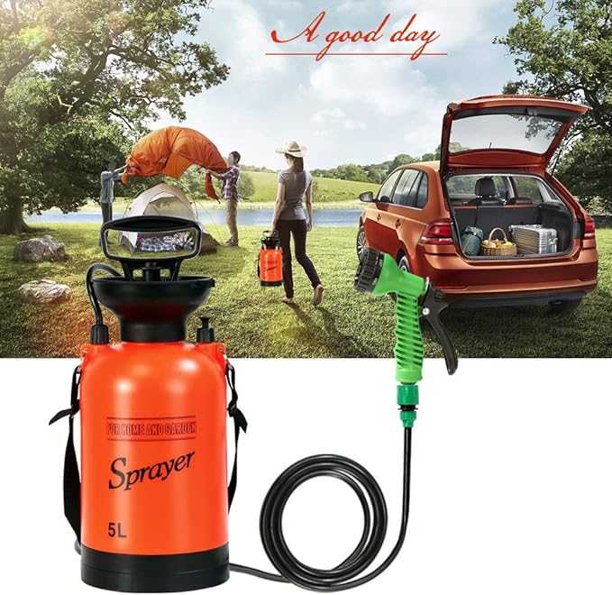 CLICIC 1.3 Gallon Pressure Sprayer with 7 Spray Modes, Camping Shower with Removable Hose and Shower Head, for Camping Outdoor Traveling Hiking and Pet Bath, 5L, Red