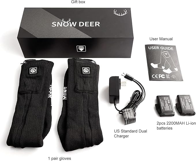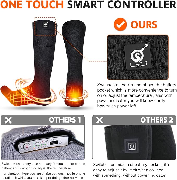 - 【Upgraded One Touch Smart Controller With Power Indicator & Use 7.4V Battery Instead of 3.7V & 5V】: SNOW DEER battery heated socks with Upgraded one touch smart controller which with power indicator. you can easily know how much power left and adjust heat settings easily. Also we used 7.4V 2200mAh lithium polymer rechargeable battery .the heating time will longer than 3.7V&5V heated socks and the temperature will be more stable.
