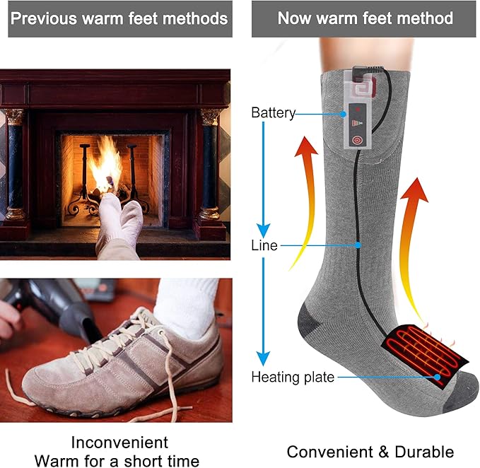 - 🔥🔥🔥 COZY THERMAL FOOT WARMER: This heat warmer socks are made of thick cotton and spandex. They're soft, warm and comfy. These cozy crew socks actually provide a lot of warmth just by themselves, even no battery.