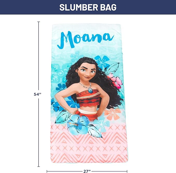 - PERFECT FIT & FUN DESIGN - This Disney Moana slumber sack includes a slumber bag measuring 27" x 54" and drawstring sack measuring 14"x 19". Featuring your favorite Disney Princess, Moana. This fun and colorful slumber sack is sure to be the center of attention at the next sleepover, take your child's bedtime adventure anywhere!