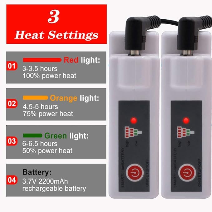 - 🔥🔥🔥 【3 Heat Settings】The electric heated socks are designed with 3 heat settings, including high heat(Red Light: 3-3.5 hours), medium heat(Orange Light, 4.5-5 hours), and low heat(Green Light, 6-6.5 hours) make these electric heated socks ideal for outdoor sports and working outside. Rechargeable heated socks are equipped with 2pcs 2200mAh Large Capacity Battery, providing you with enduring warmth.