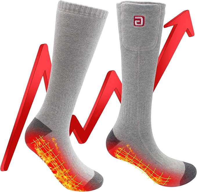 - 🔥🔥🔥 【Upgraded Heating Element】: Electric heated stockings are made of 91% Acrylic, 5% Nylon, 3% Polyester, 1% Spandex, soft and breathable, keep your feet dry, warm and comfy. These cozy crew socks actually provide a lot of warmth just by themselves, even with no battery. It will be a good gift for your family and friends.