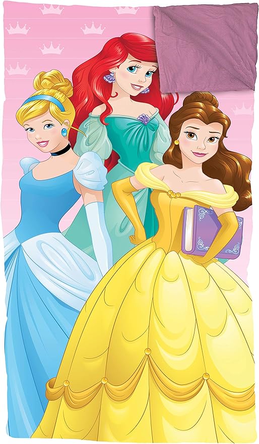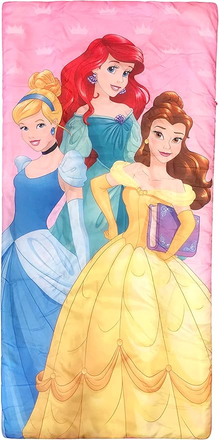 - PERFECT FIT & FUN DESIGN - This Disney Princess slumber sack includes a slumber bag measuring 27" x 54" and drawstring sack measuring 14"x 19". Featuring your favorite Disney Princesses, Ariel, Belle, and Cinderella. This fun and colorful slumber sack is sure to be the center of attention at the next sleepover, take your child's bedtime adventure anywhere!