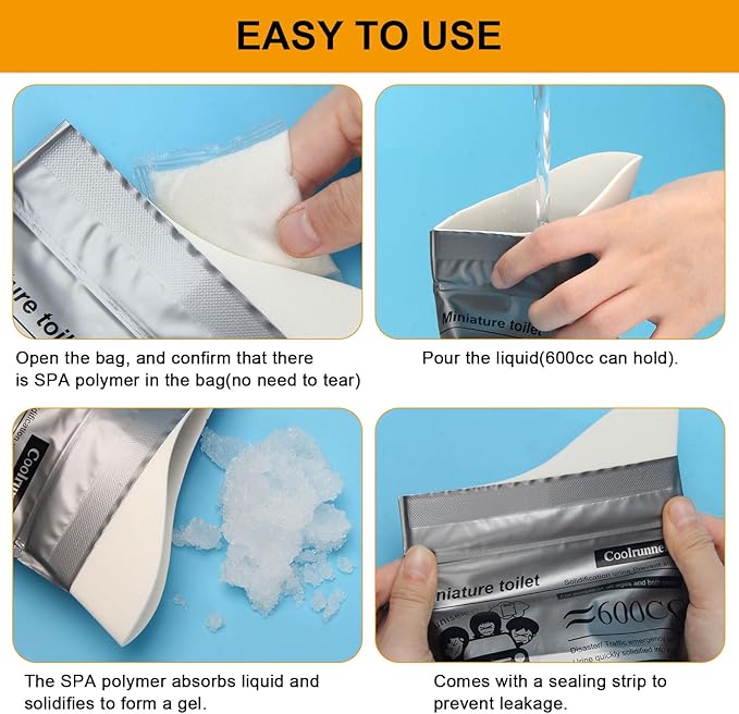 - Leak-proof & Eco-friendly - Portable camping pee bags instantly gels after absorption of liquid thus, no leaking, sealable even upside down. It could absorb urine, vomit, or other liquid waste and turns it into an odorless, spill-proof gel.