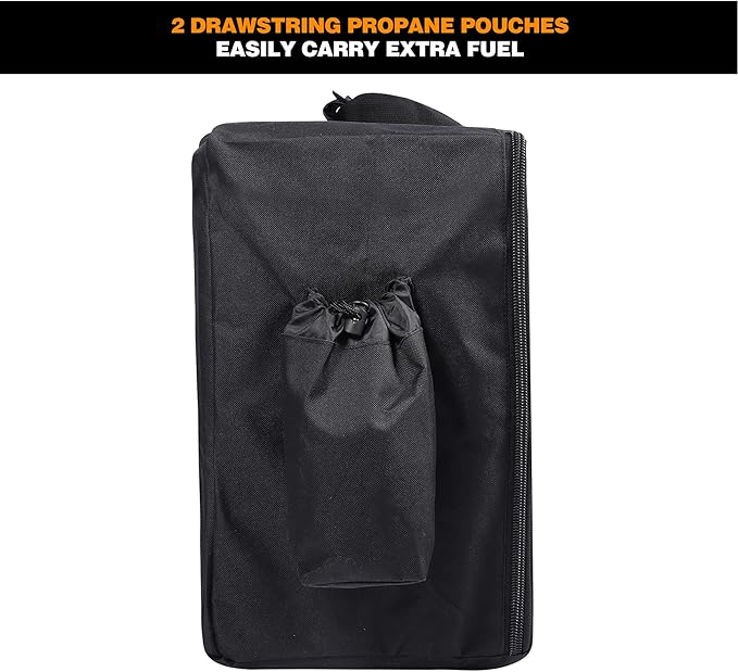 - Multi-pocket design: Equipped with 2 drawstring propane pouches to easily carry extra fuel, also comes with inner pockets for the windscreen and accessories