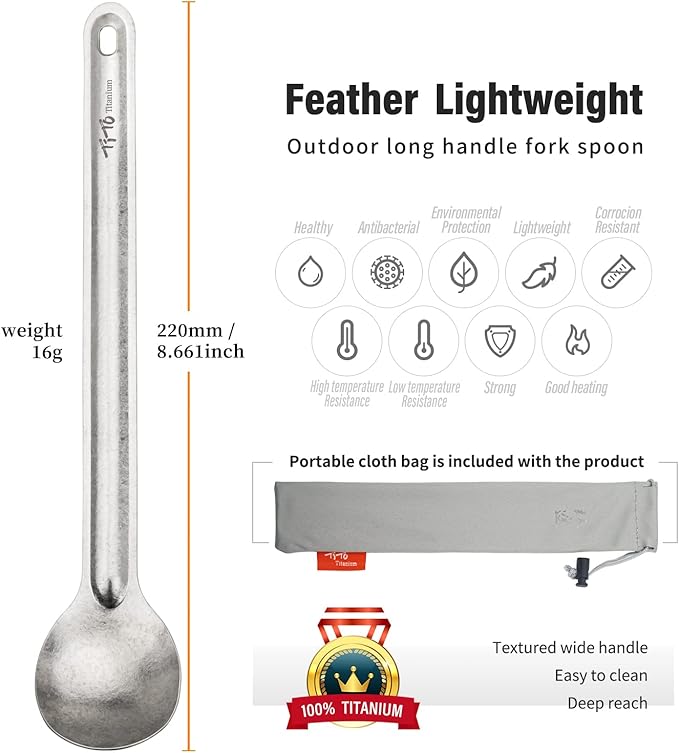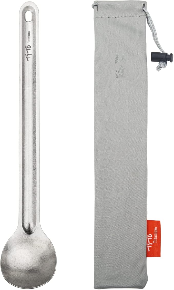 TiTo Titanium Long Handle Spork and Spoon Eco-Friendly Ultralight Portabale Flatware for Outdoor Camping Backpacking Hiking Travel Picnic Tableware with Bag (Bright Titanium Spoon)
