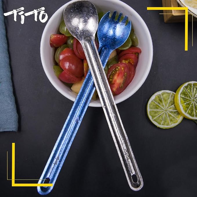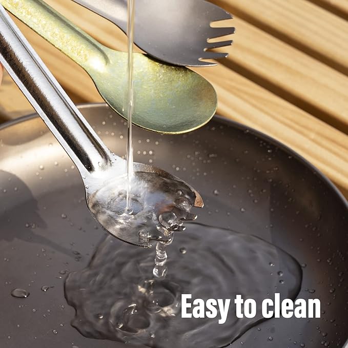 - 【Easy to clean】Cleaning options are limited on the go. You can wipe them and / or rinse them with cold water as titanium is smooth surface, don't have to worry about flavor or oils linger on spork and spoon. And dishwasher safe.