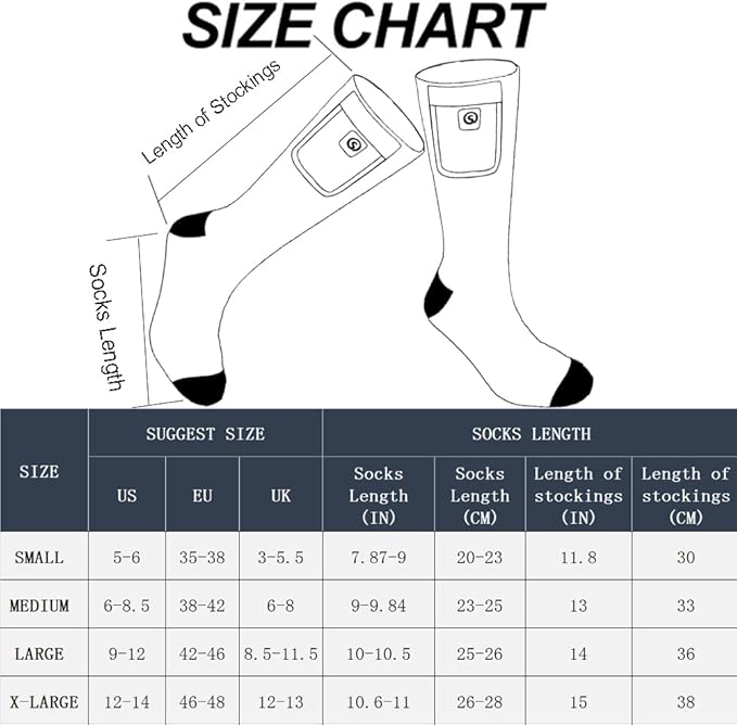 - 【High Quality After Sales Service】All our heated products have good after sale service support.If you have any problems (Size, quality, etc.), please contact us by email.Socks are available in four sizes S, M, L, XL.Please select the appropriate size according to our size chart picture.