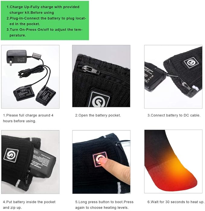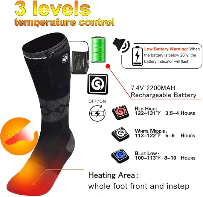 - 【7.4v 2200mah Batteries&3 Settings Temperature Controller】Battery socks powered by with 7.4V 2200mah rechargeable lithium battery packs,full charge around 3-4 hours,duration 3 - 8hours with 3 heat setting. controller LED red is for high temperature,white for medium temperature,blue for low temperature.you can easily adjust the temperature.