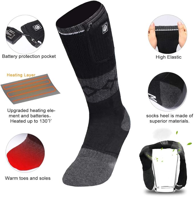 - 【Soft and Breathable Material】Rechargeable Electric Battery Heated socks made with 80% cotton , 12% polyester ,8% Elastane material.Absorbent, quick-drying, elastic thickened. Imported heating elements and quality material.Fast heating in 30 seconds,the feet get comfortable and warm.Sun Will heated socks are the best choice for Halloween,Thanksgiving,Birthday and other festivals.