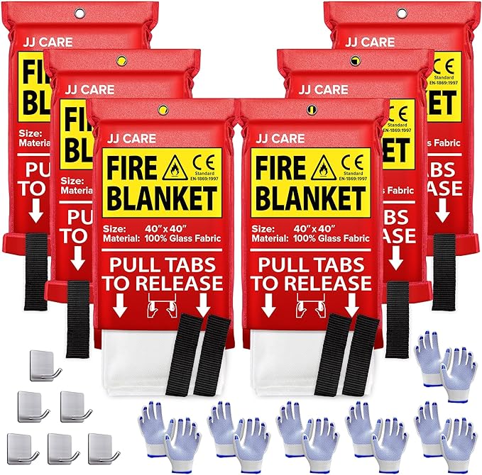 JJ CARE Fire Blanket – 6 Packs with Hooks and Gloves – Emergency Fire Blanket for Home & Kitchen, High Heat Resistant Fire Suppression Blankets for Home Safety, Kitchen, and Camping