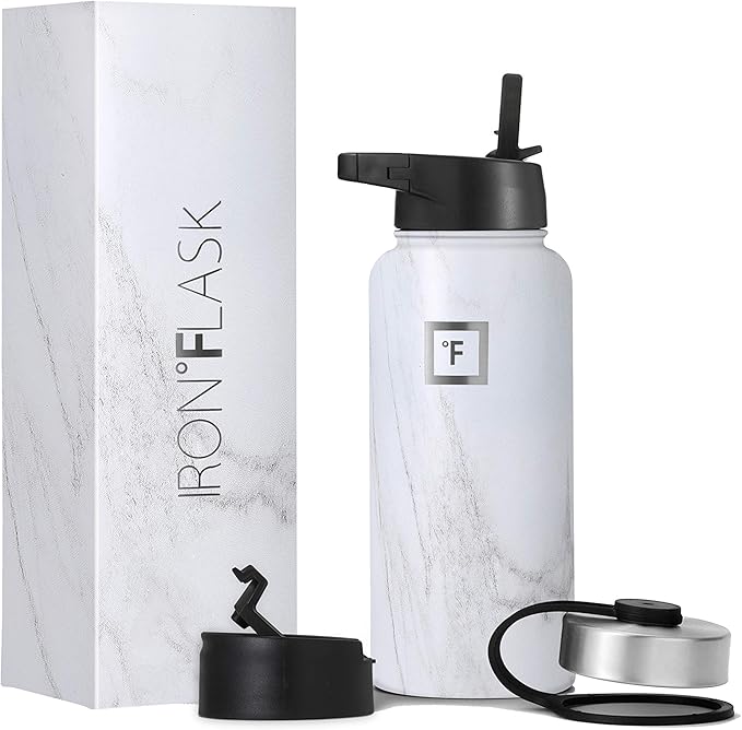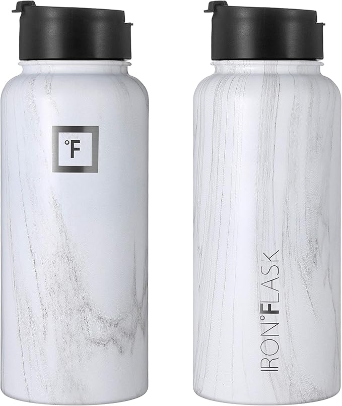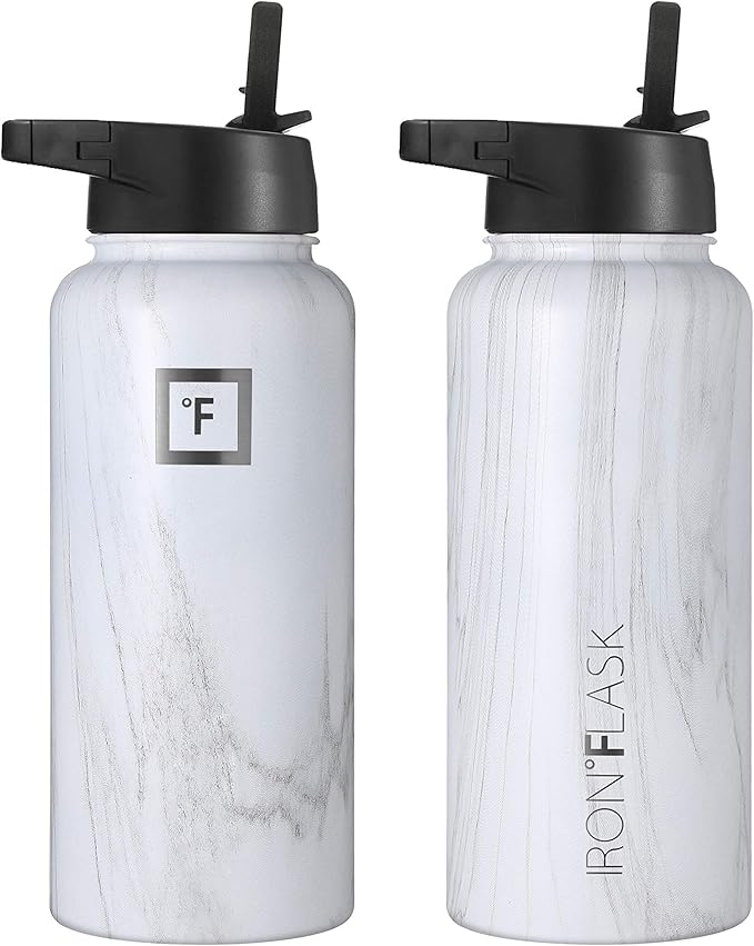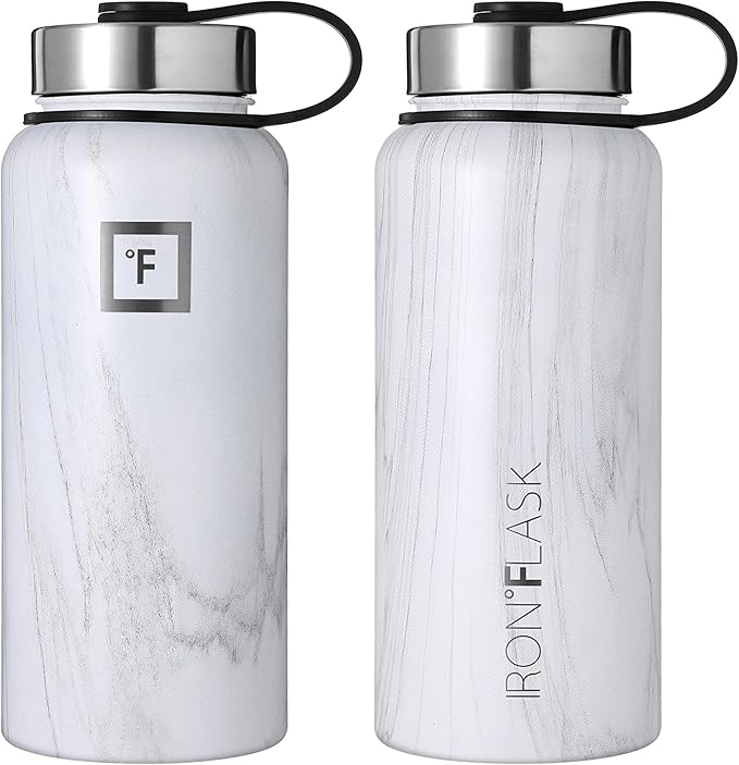 IRON °FLASK Camping & Hiking Hydration Flask, Wide Mouth, 3 Straw Lids, Stainless Steel Outdoor Water Bottle, Double Walled, Insulated Thermos, Metal Canteen - Carrara Marble, 32 Oz