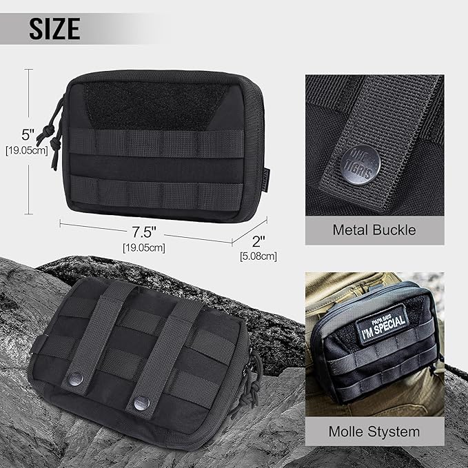 - MOLLE SYSTEM: Tactical Molle Pouch with Molle back straps can be attached to tactical backpack, battle belt, or other Molle gears as an extra exterior pouch. Loop panel for military patches with webbing & straps for MOLLE compatible gear.