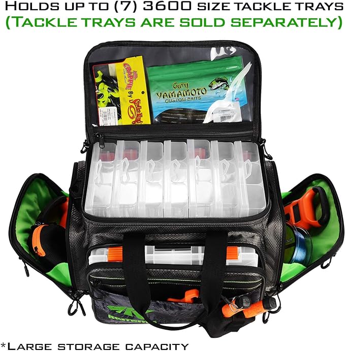 - ORGANIZE – The Hoss tackle bag is perfect for transporting fishing gear. A large main section holds (6) 3600 size tackle box trays horizontally or vertically (not included, but available separately from KastKing) and internal pockets store small items such as keys, wallet or phone. 7 external zippered and slip pockets provide storage for trays, terminal tackle, tools and more. External rubber coated mesh pockets can secure leader line, rain gear, pliers, or any other items for quick access.