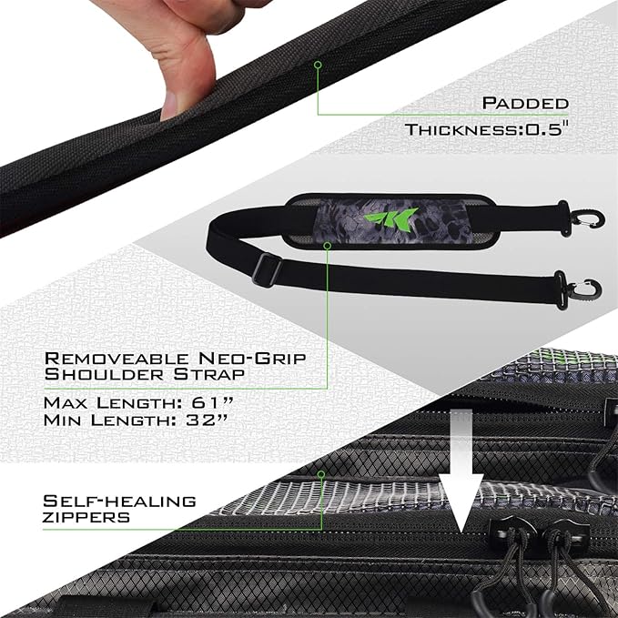 - TOUGH and WATER RESISTANT – KastKing Hoss tackle bags are made from tough 420D rip-stop nylon material for exceptional long term performance and reliability. A hydrophobic coating sheds moisture from the outside and an inner PVC layer provide double protection to ensure your fishing tackle is protected from damage and the elements. KastKing’s compression molded waterproof bottom repels standing water and the tacky material grips any surface to ensure the bag doesn’t slide.