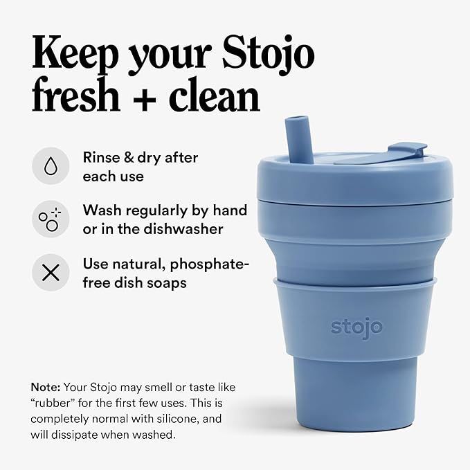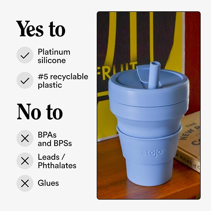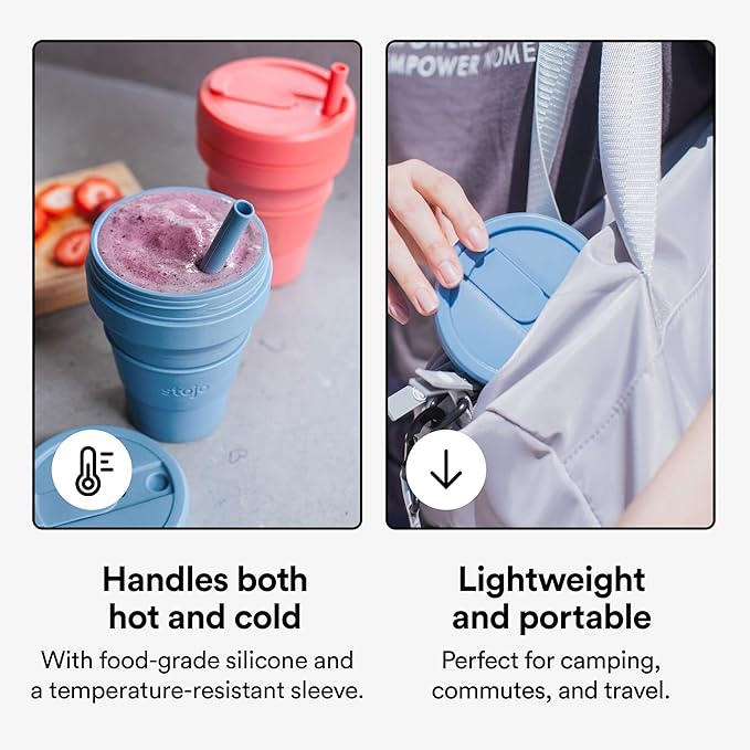 - Collapsible cup: It’s literally never been easier (or more fun) to bring your own reusable cup! This compact cup collapses down to just 2 inches. Whether you’re sipping coffee or a smoothie, the 16 oz Stojo is perfectly portable for your commute, camping trips, tea at home, and travels. When you’re done, simply remove the heat sleeve, open the tab, and collapse it down. Leak-proof, includes a straw, fits standard cupholders, and get a load of that Steel Blue color!