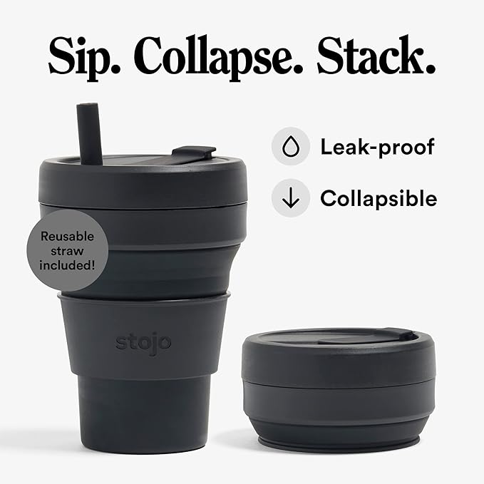 STOJO Titan Collapsible Travel Cup With Straw - Ink Black, 24oz / 710ml - Reusable To-Go Pocket Size Silicone Cup for Hot & Cold Drinks - Camping and Hiking - Microwave & Dishwasher Safe