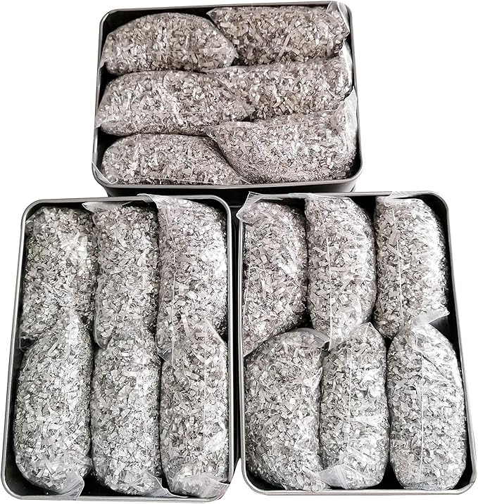 - 18 resealable zip closure bags 3 1/6 in long x 2 1/2 in wide, full of magnesium new shavings, chips, shreds, and spirals with 3 containers.