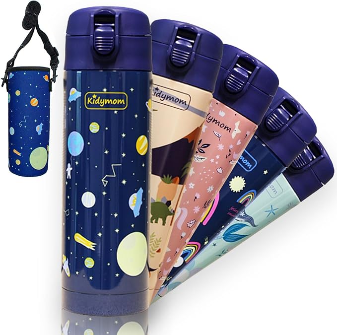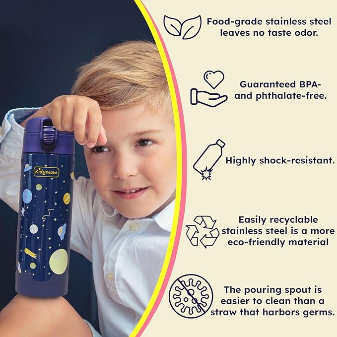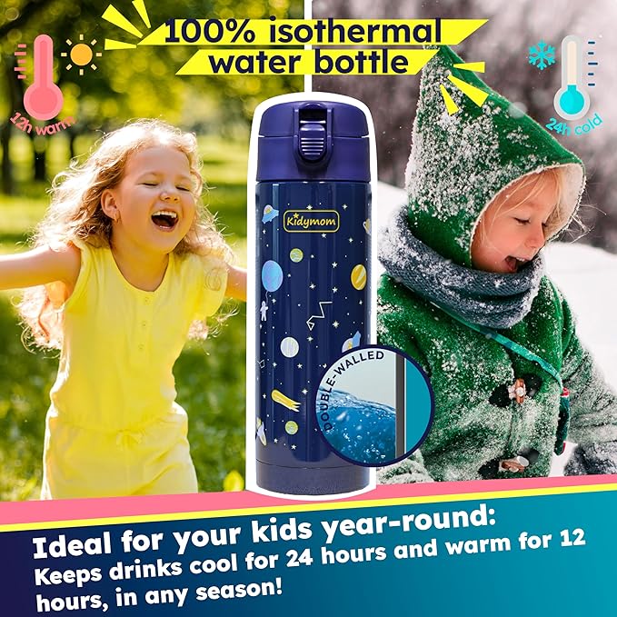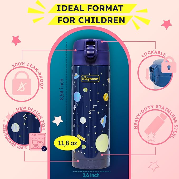 - [30-DAY MONEY-BACK GUARANTEE] The eco-friendly Kidymom insulated bottle replaces a single-use plastic water bottle promoting zero waste. An ideal gift to offer for girls or boys ! Last but not least, by choosing our bottles you benefit from a 30-day satisfaction or money-back guarantee. No more reasons to hesitate! What are you waiting for?