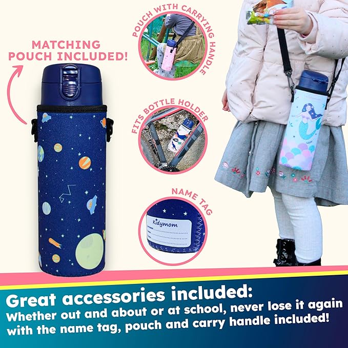 - [COMPLIMENTARY TRANSPORT POUCH INCLUDED] Kidmymom's stainless steel bottle for children comes with an insulated bag and nylon straps that facilitate transportation (straps are located inside the bottle). An ideal kit for children during sports or outdoor activities. The lightweight bottle becomes easily transportable! The additional feature of the bag: a name tag to fill in with the child's details (name and phone) to prevent losses at school. Thought by parents!