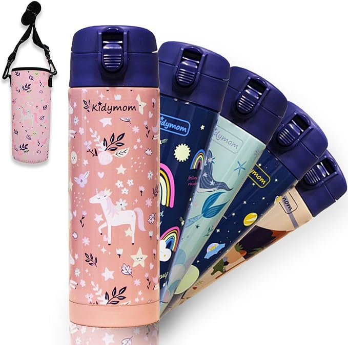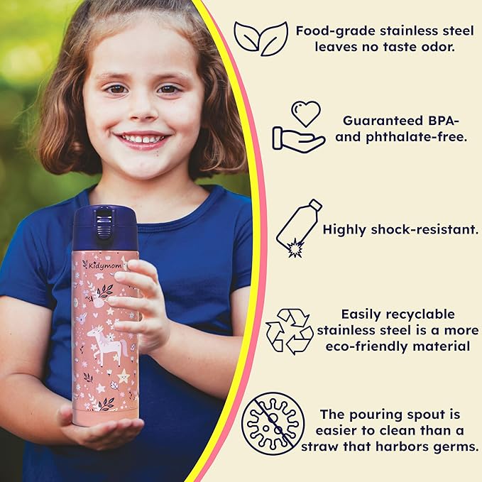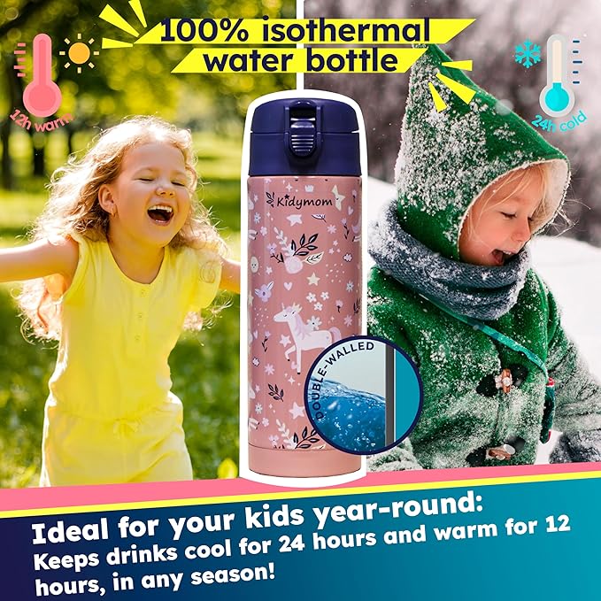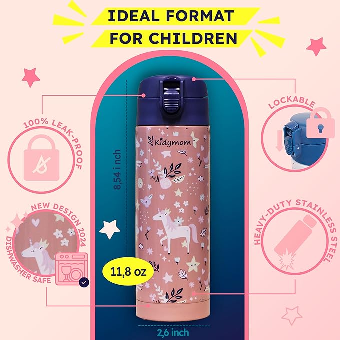 - [30-DAY MONEY-BACK GUARANTEE] The eco-friendly Kidymom insulated bottle replaces a single-use plastic water bottle promoting zero waste. An ideal gift to offer for girls or boys ! Last but not least, by choosing our bottles you benefit from a 30-day satisfaction or money-back guarantee. No more reasons to hesitate! What are you waiting for?