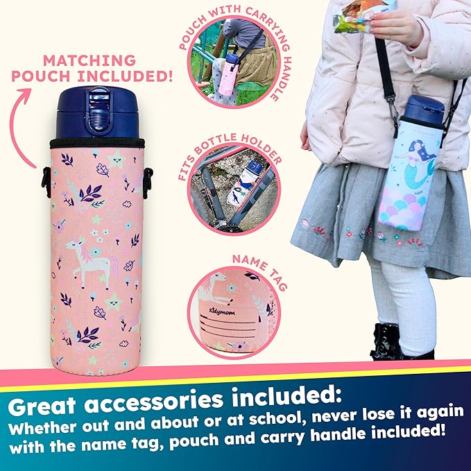 - [COMPLIMENTARY TRANSPORT POUCH INCLUDED] Kidmymom's stainless steel bottle for children comes with an insulated bag and nylon straps that facilitate transportation (straps are located inside the bottle). An ideal kit for children during sports or outdoor activities. The lightweight bottle becomes easily transportable! The additional feature of the bag: a name tag to fill in with the child's details (name and phone) to prevent losses at school. Thought by parents!