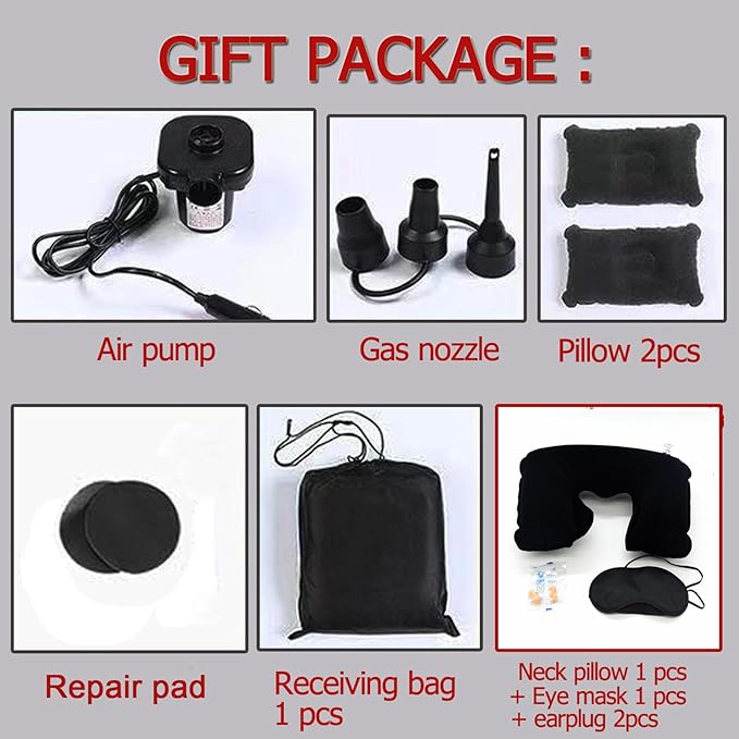 - Car Inflatable Mattress Item:Car air bed only 2.5 KG weight,Can be folding,Easy to carry.This package include 1 air bed,2 air pillows,1 air pump,1 air foot Piers,1 soft travel neck Inflatable pillow,1 sleep mask,2 sleep earplugs,1 repair pad.