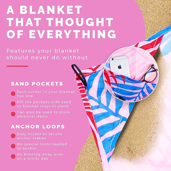 - DOUBLE ANCHORED DESIGN - The sheet style beach blankets sandproof are double anchored so it won't blow away on windy days. Your no sand beach mat has 6 yellow plastic stakes and 4 corner sand pockets to hold it, leaving you free to enjoy the sun