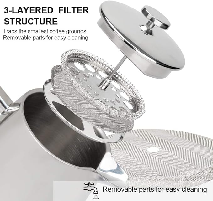 - 3-LAYERED STAINLESS STEEL FILTER STRUCTURE traps the smallest coffee grounds to produce an exceptional full-bodied flavor