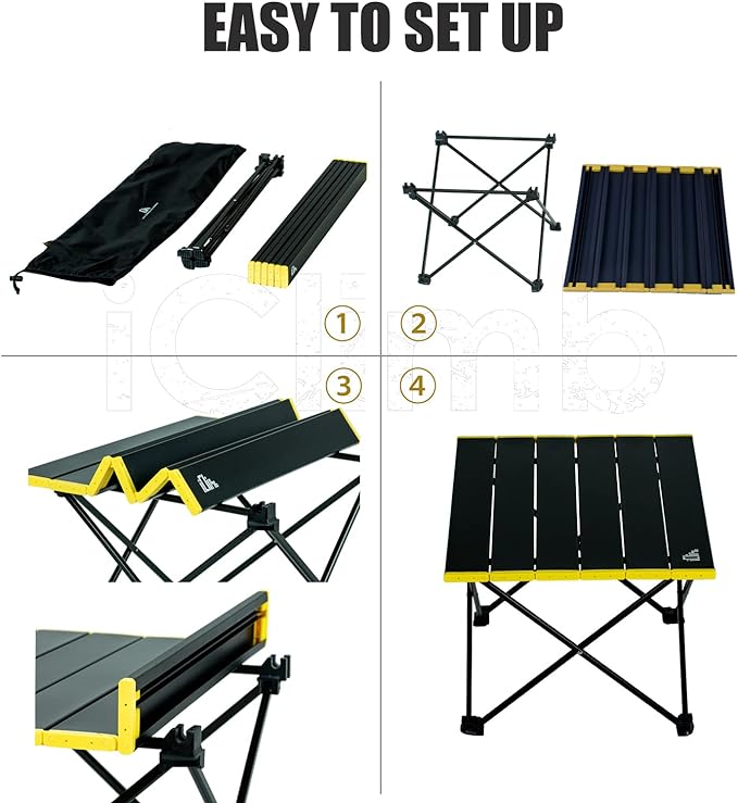 • Ultralight, made of aerospace-grade aluminum alloy, only 2.2 lbs; Max Load 66 lbs; Unlike wooden or nylon-top tables, this table is durable, waterproof, corrosion-resistant, easy to clean; Sturdy joints and connectors, plus anti-slip rubber feet make this table more stable, and the legs won't fold, bend, or disengage on different terrain; Very easy to set up, just open the base frame and attach the table top, enjoy your leisure time in seconds