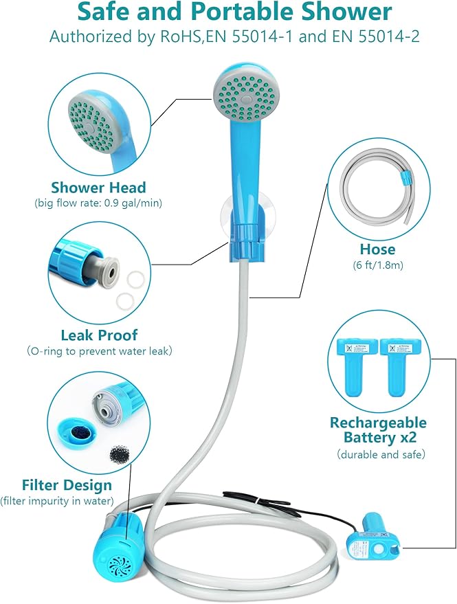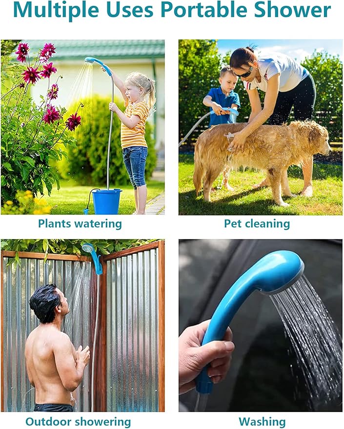 - 【Multiple Uses Portable Camping Shower】 High power camping shower pump provides stronger suction, operating at a consistent 0.9 gal/min (3.5 L/min). The electric portable camping showerhead offers a comfortable and stable flow. A water purification filter is with the electric pump to prevent foreign objects from being pumped into the water. You can remove the filter and wash it. Fit INDOOR/OUTDOOR showering, camping, road trip, kid bathing, pet cleaning, car-washing, and garden watering.