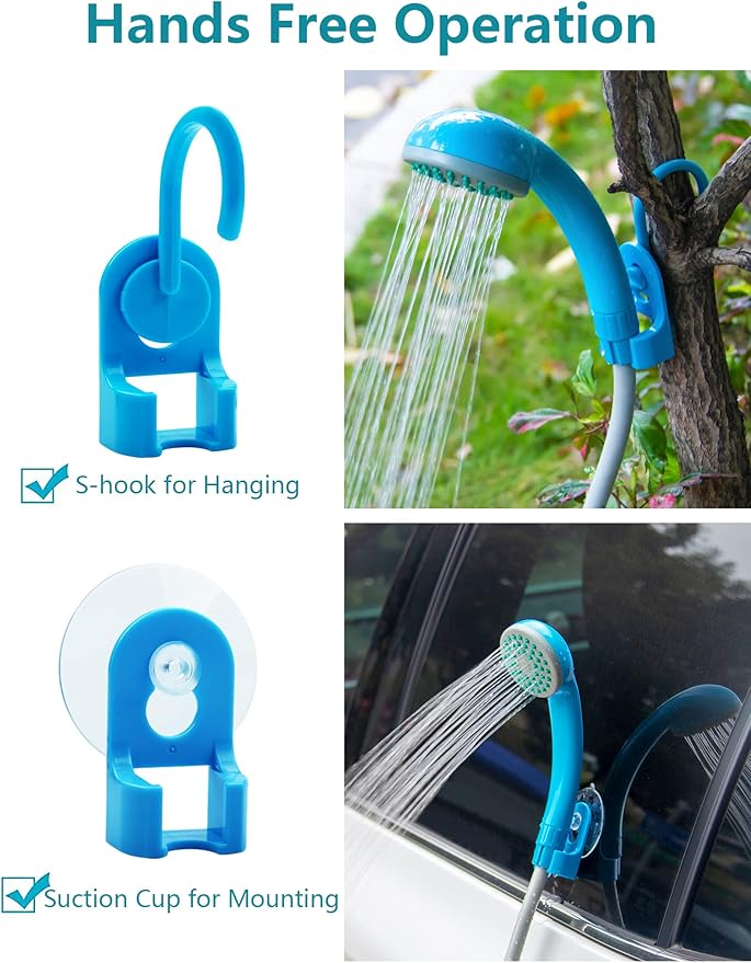- 【1 Year Warranty Riigoo Portable Outdoor Shower】 Our camp shower can securely stick to any flat surface with provided suction cup. Bonus S-style hook lets you hang it safely overhead. And the long hose is up to 2m, more convenient and practical. Riigoo camping shower conforms to the safety requirements of RoHS standards, EN 55014-1 and EN55014-2, and comes with 1 Year Free Warranty and Full Refund within 60 Days to ensure your pleasant shopping experience. Any problems, feel free to contact us.