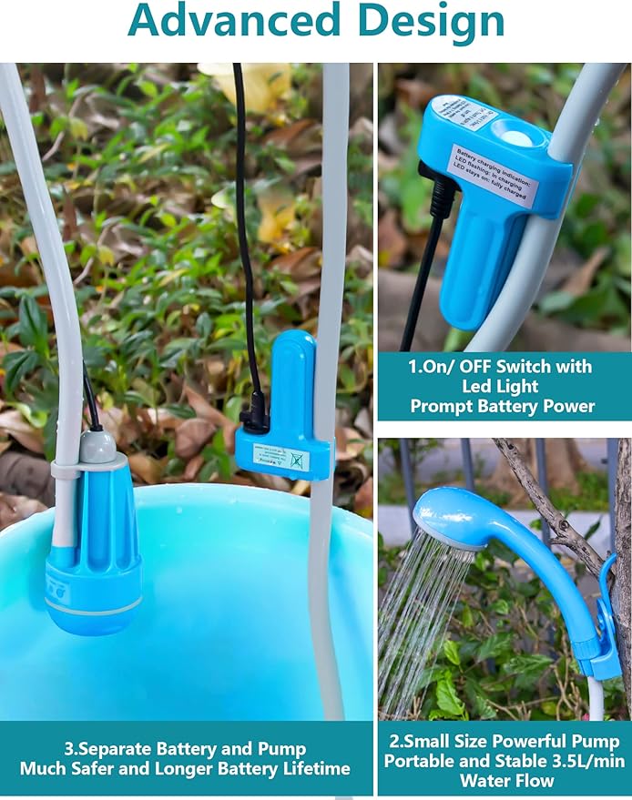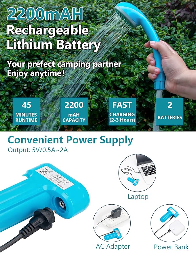 - 【2 Upgraded Durable Rechargeable Battery】Our portable camp shower comes with 2 batteries. They are separated from the camping shower pump as well as can be attached to the water pipe. External on/off switch design, no need to immerse the batteries into the water, which can protect you and prolong portable showers' lifetime. The updated version of batteries adds LED light, which prompts battery power. The full charge of 2 batteries allows continuous use for 90-120 mins. Enjoy showering anytime.